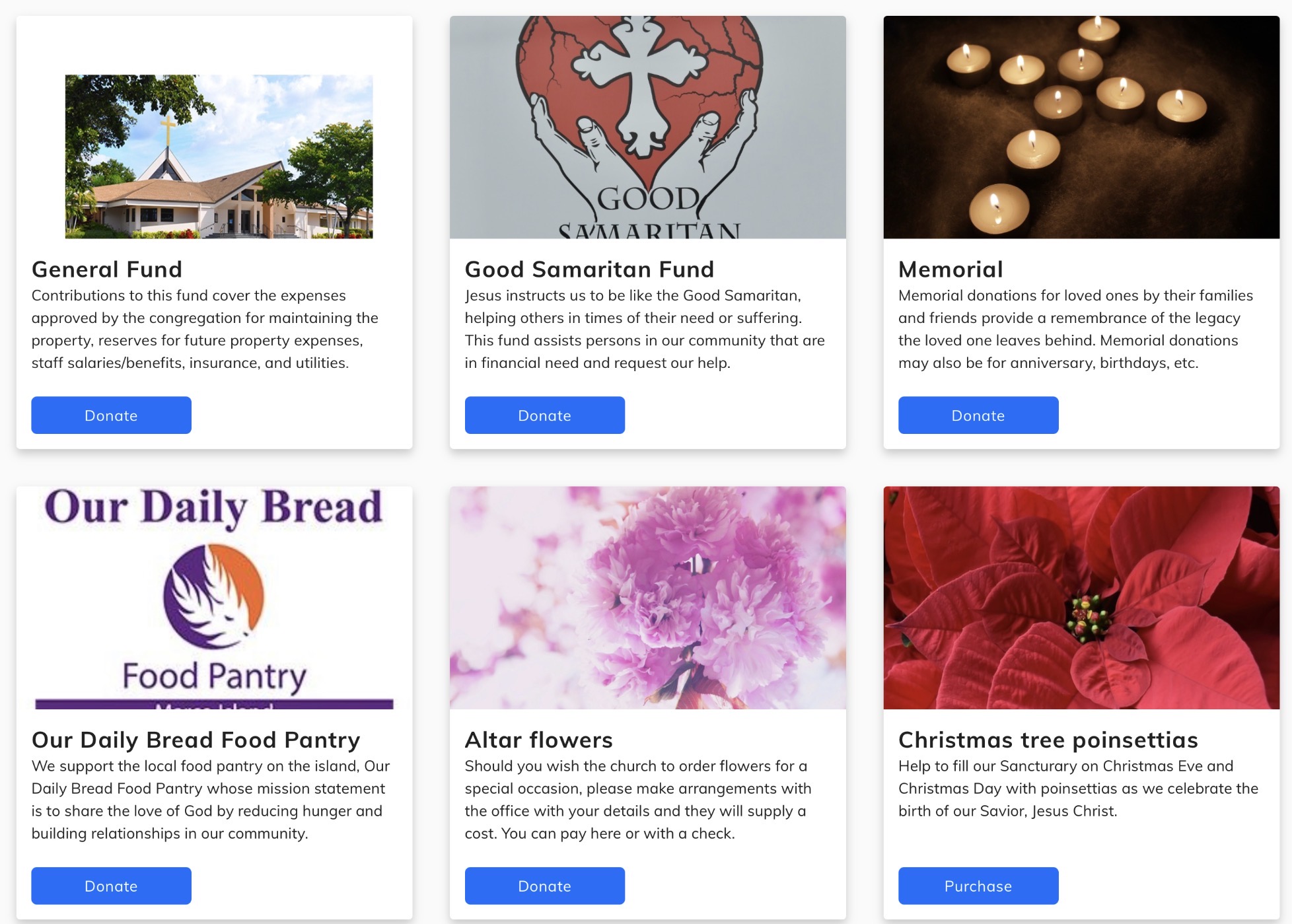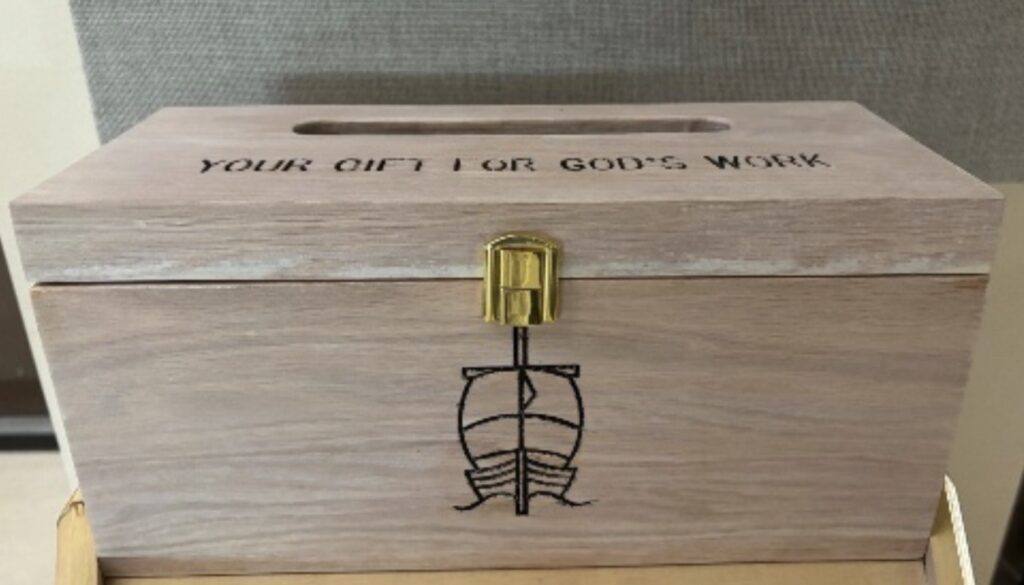 You can place your offering in the offering boxes located at the front of the church on either side of the chancel or at the back of the church on either side of the center aisle.